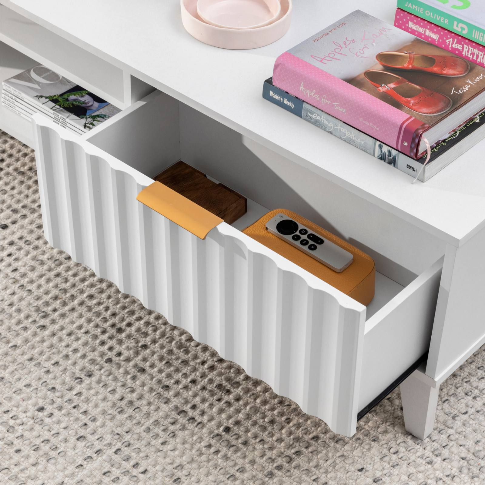 The Airlie Coffee Table in white is the perfect piece for your living room. It features wooden legs, rose gold handles and a ripple design for a contemporary look. It’s bright white color brings an inviting air to any space in your house.