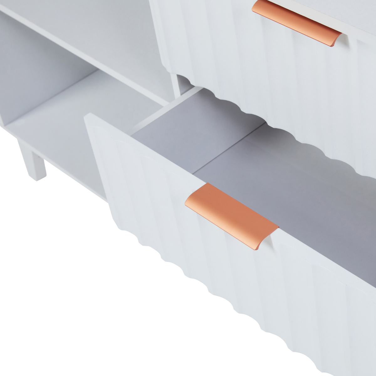 It features wooden legs, rose gold handles and a contoured design on the drawer fronts, creating texture and movement. It’s bright white color brings an inviting air to any space in your home.